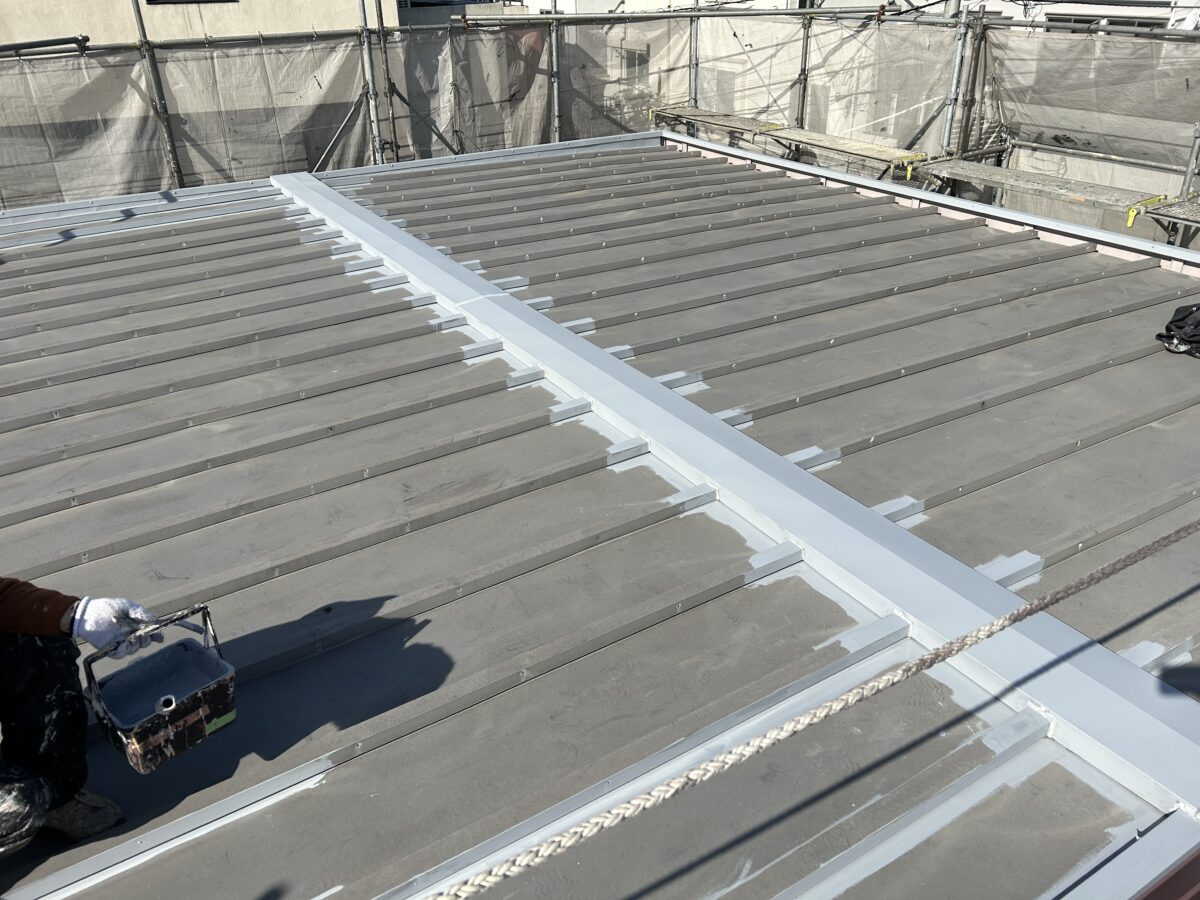 まずは鉄板瓦棒屋根のサビどめ塗りです。(使用材料はSK化研 マイルドサビガードを使用)高低差(凹凸)のある塗装部をいきなりローラーを使用して塗る事はできませんので、ハケを使用して「ダメ込み」を言われる作業から行なっていきます。今回の屋根の様に平面に近い塗装部位は、座って塗って立ち上がり移動して座って…の繰り返しで見た目よりも重労働ですから大変ですが、この過程をシッカリと行わないと仕上がりに大きな差が出てしまいます。仕上げ塗りに使用する塗材はSK化研の一液プレミアムルーフシリコンとなります。
