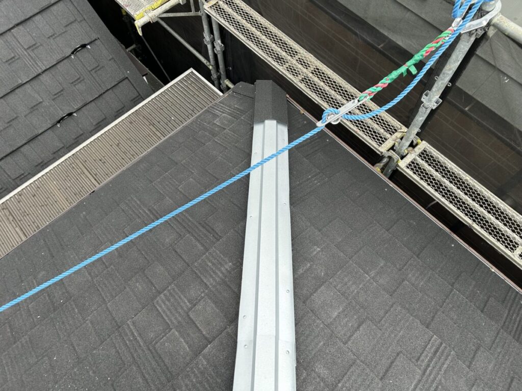 棟板金の取り付けは、墨糸でセンターラインを決め「軒先」と「最上部」の角度を出して行います。特に「最上部」が寄棟屋根形状で三叉等がある場合にはとても重要な工程になります。仮に角度が合っていない場合ですが、防水上は問題が無くても仕上がりが汚くなりますから注意して確認します。(ですが弊社の職人は私が言わなくても綺麗に仕上げてくれますが)