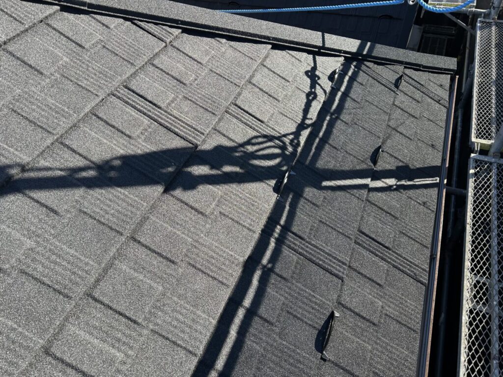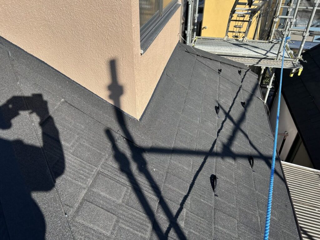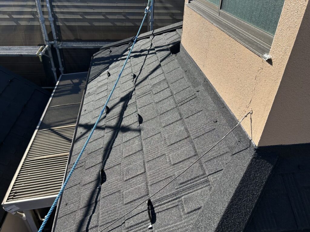 年内最後の屋根工事の現場が2日間ほど天候不順で休工させて頂いていましたが、今日は打って変わって日差しの下では上着を脱いでも大丈夫なほどの快晴に恵まれました。今日の工事工程は「棟板金の取り付け」と「壁際雨押え板金」・軒先等のストーンチップ塗布でした。