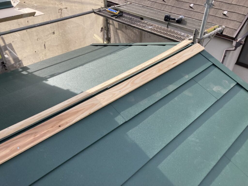 昼過ぎに現場管理に行くと、既に棟板金の下地木材取り付けまで進行していました。