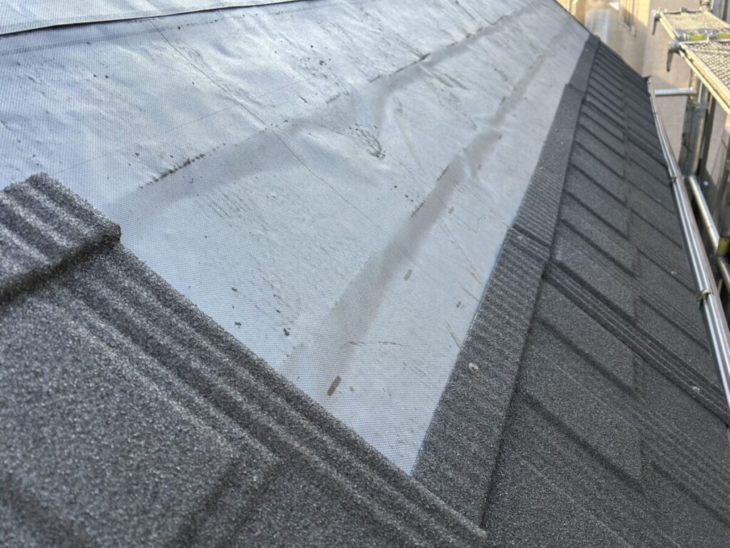 今朝の東京は体の芯から冷える様な気温「4度」。明日の天気予報もコロコロと雪?雨?曇り?と屋根工事にとっては油断できないモノでした。昨日の内に下地材の粘着性ルーフィング張りを終えてはいますが、職人との打ち合わせで「降雪・降雨」を前提とした内容で工事を進行させていく事にしました。