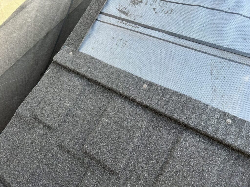 まずは「軒先水切り」(唐草)がシッカリと雨トイ内に収まり、上に載せる屋根基材が雨水をトイ内部に流してくれるかを確認。