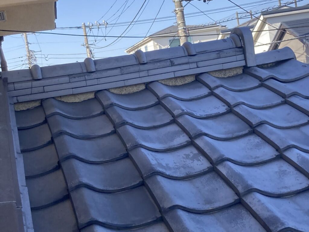 既存屋根材は「素焼きかわら」でした。[ 関東圏に多い「桟葺き」でしたので、重量目安はおおよそ 60kg前後/1㎡(180kg前後/1坪) ]最も重い部類の屋根材になります。