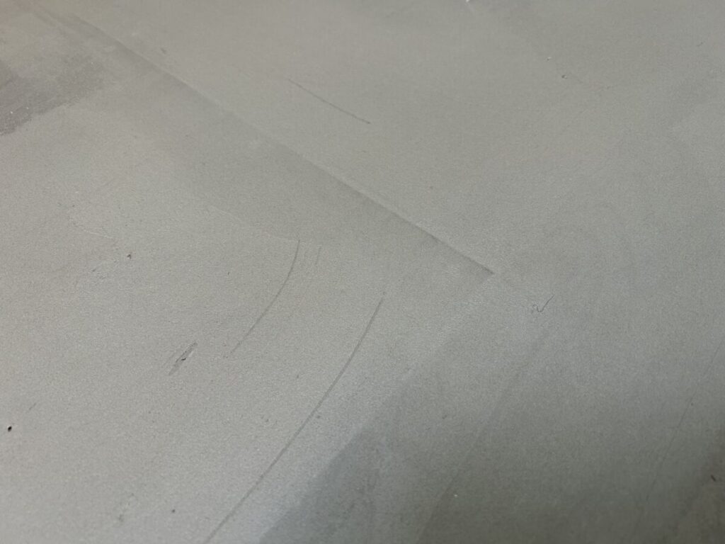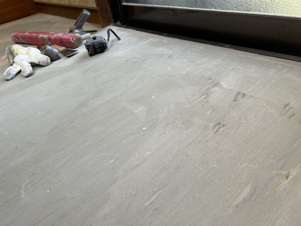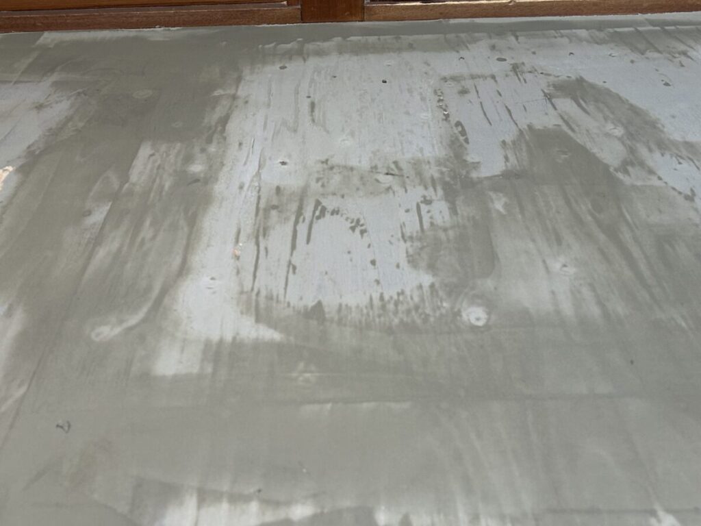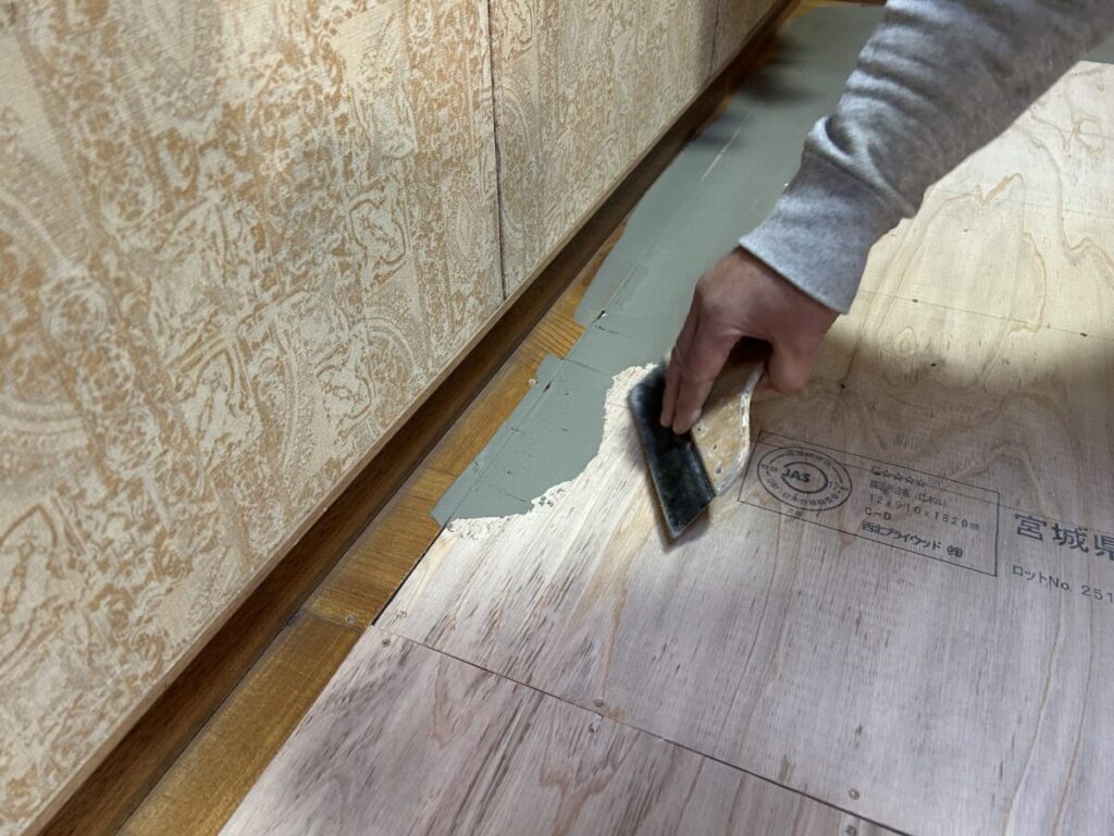 大工さんが「墨出しと水平調整」をしながら施工した構造用合板の表面を、クッションフロア(以下CF)張りの職人さんが掌で触り確認する事から工事が始まります。これは「僅かな段差「や施工後のCFに何かしらの影響が出かねない「ささくれ」を探すためです。この作業が終わると床に下地パテ材を擦り付ける様に塗っていきます。写真にもありますが、パテが乾くと痩せて構造用合板の継ぎ手部分などは「線」が見えてしいますので、パテは2度塗っていきます。