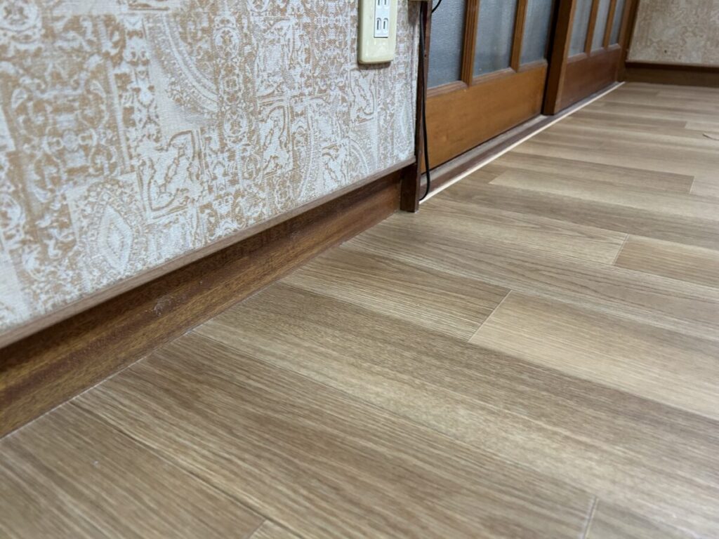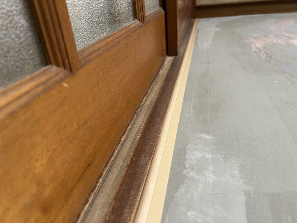 パテが乾いた後に、新規CFの張り位置を割り出し余剰部分を予め切断しておきます。また、開口部(今回は敷居)に見切り材を取り付けておきます。