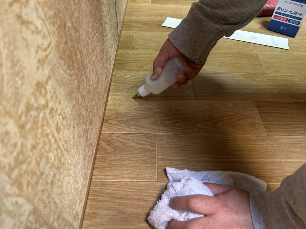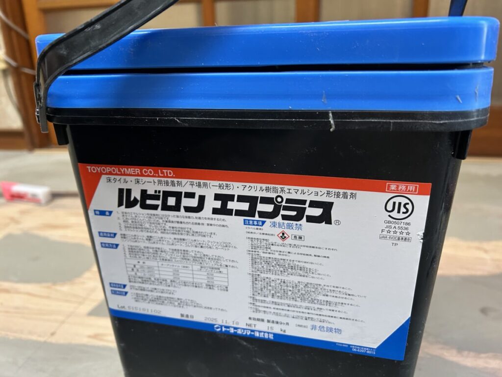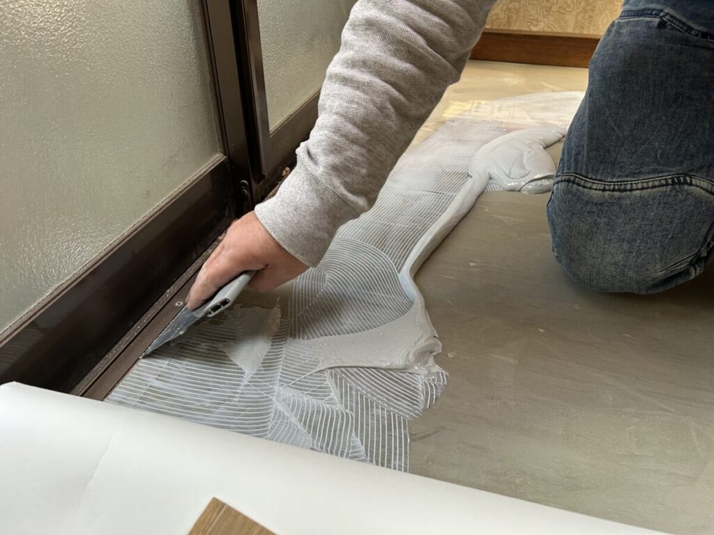 いよいよCF張りです。専用の接着剤を床一面に塗布します。特に端部は念入りに確認しながら行います。