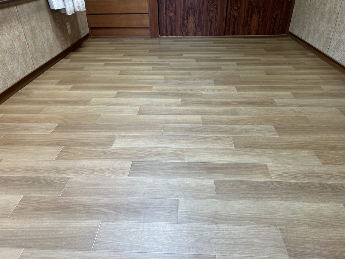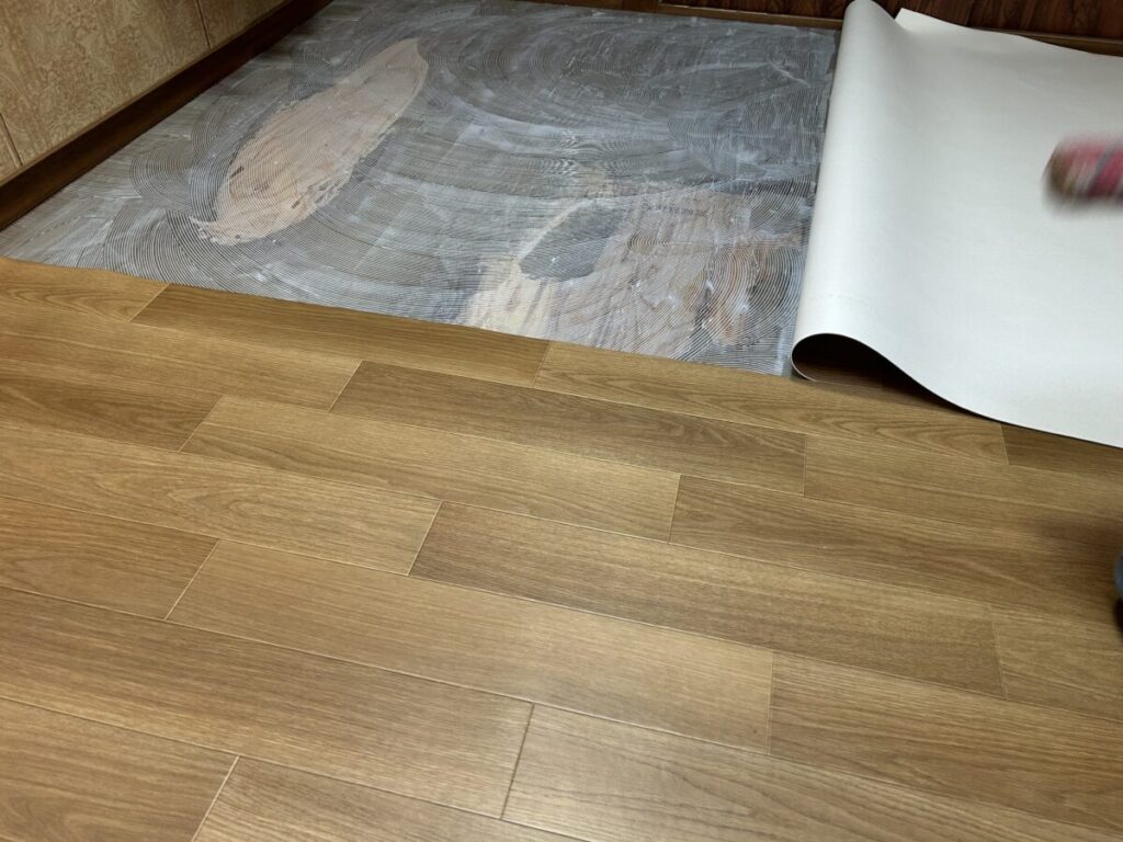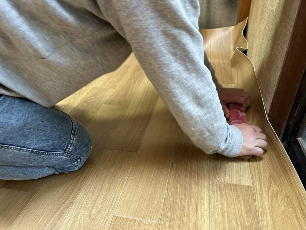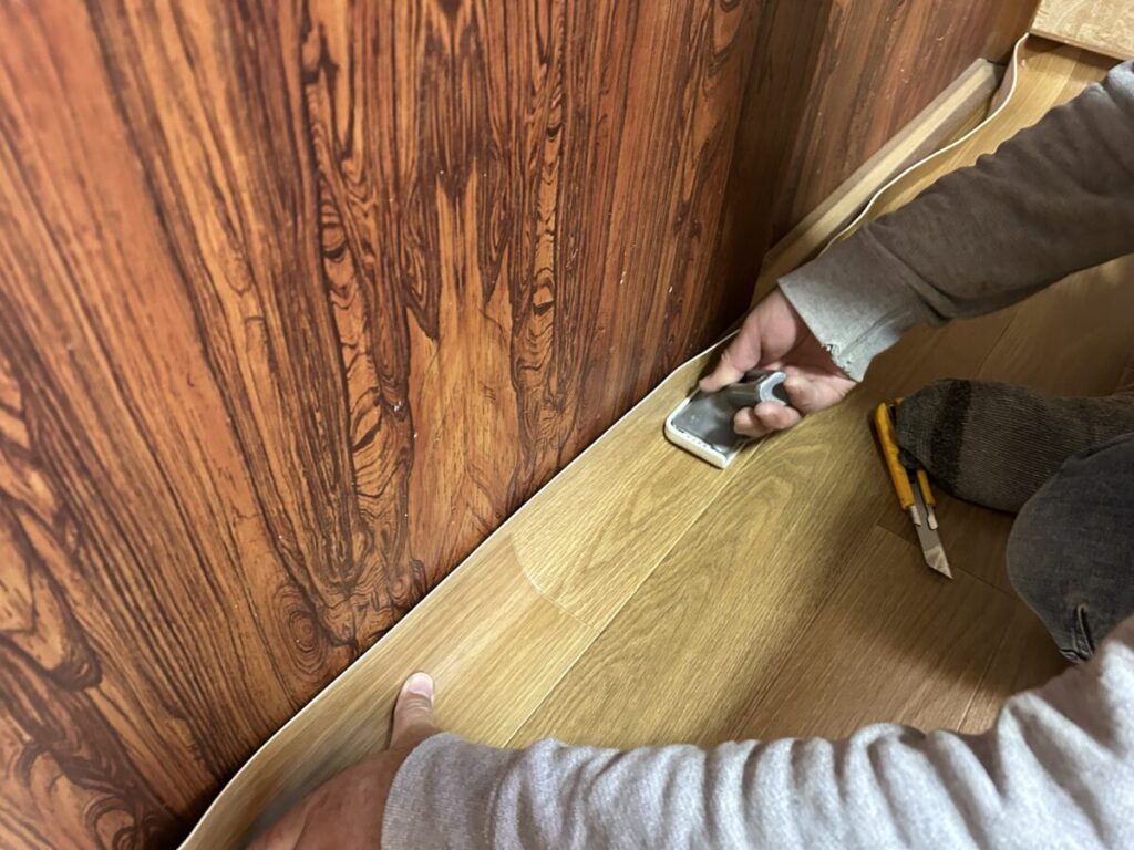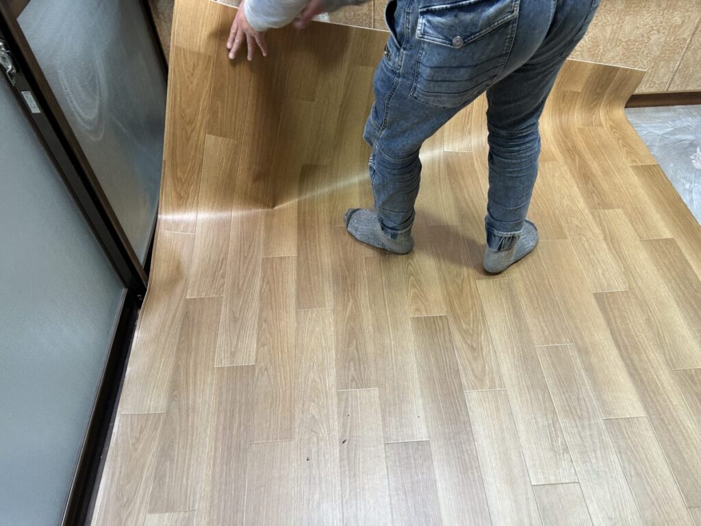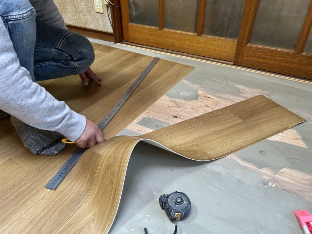 割り出した墨位置に合わせて乗せてから、床とCFの間の空気を外へと押し出して密着させていきます。