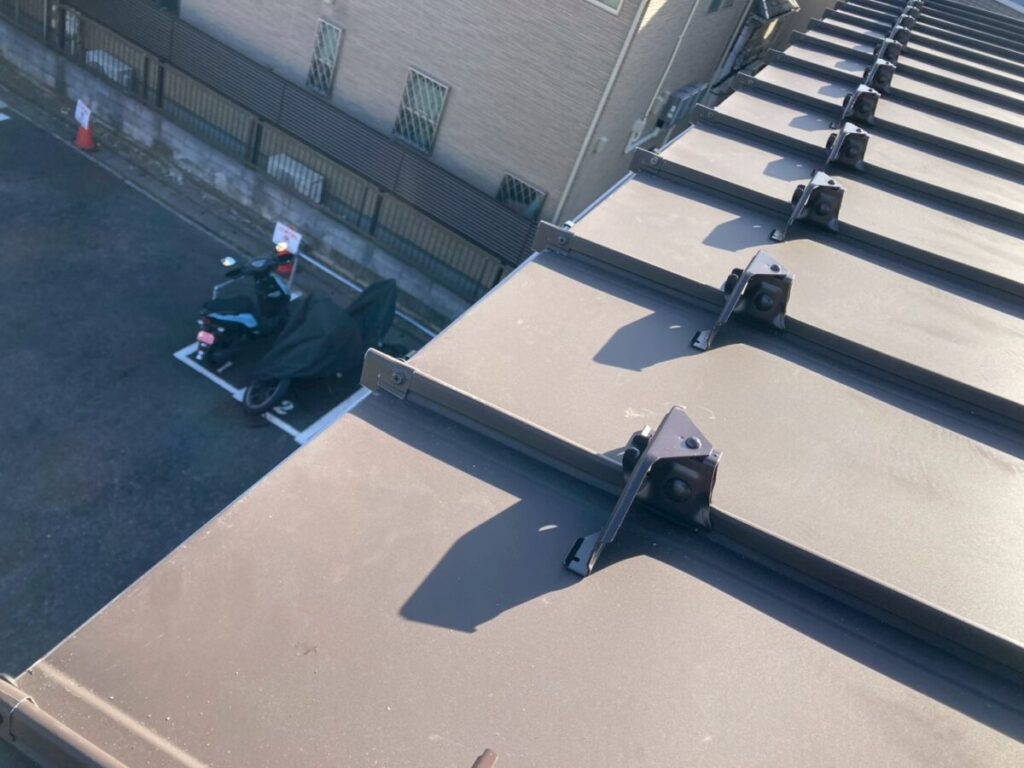 緩勾配とは言え落雪の可能性のありますので屋根材純正のシッカリと雪止め金具も取り付け、残すは棟と壁際の防水処理のみとなりました。