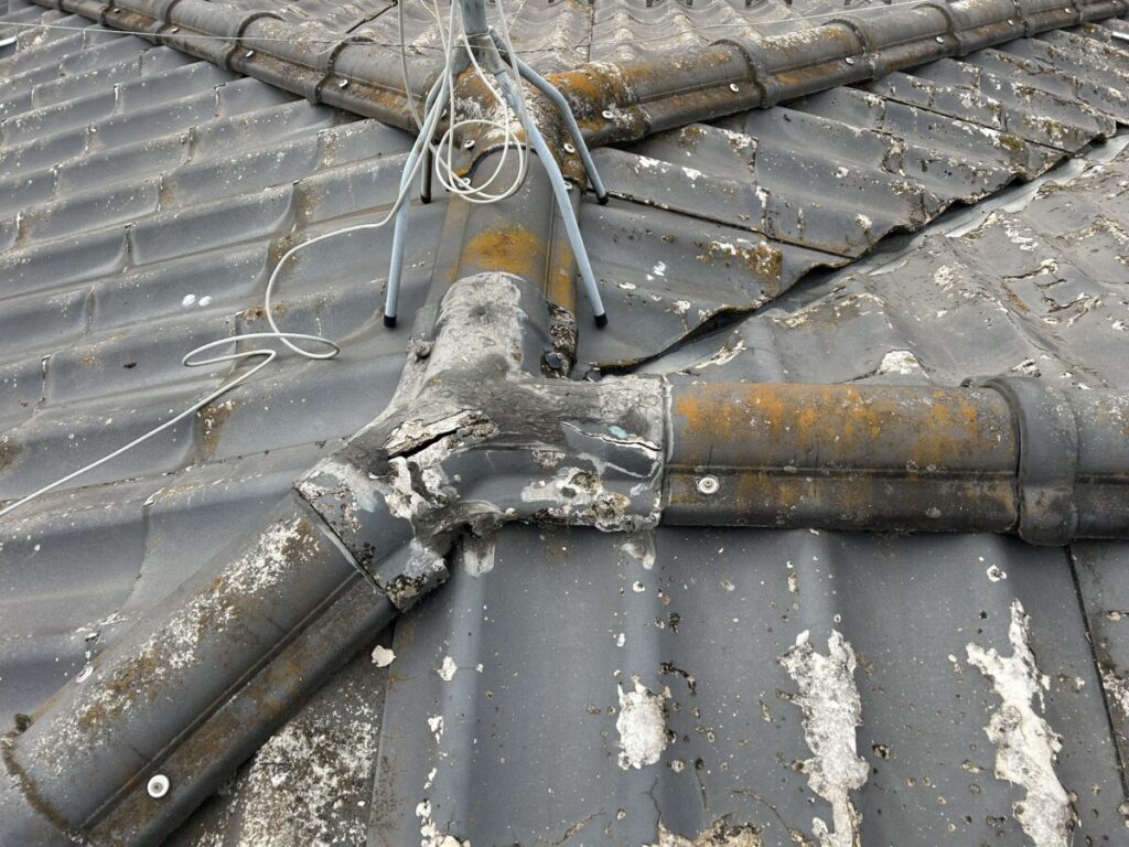 大きく目立ったのは三叉部のみで、その他の軒先・棟・袖(けらば)・谷水切り・使用雪止め金具などは経年劣化していましたが「雨漏りに直結」しそうな問題点はありませんでした。