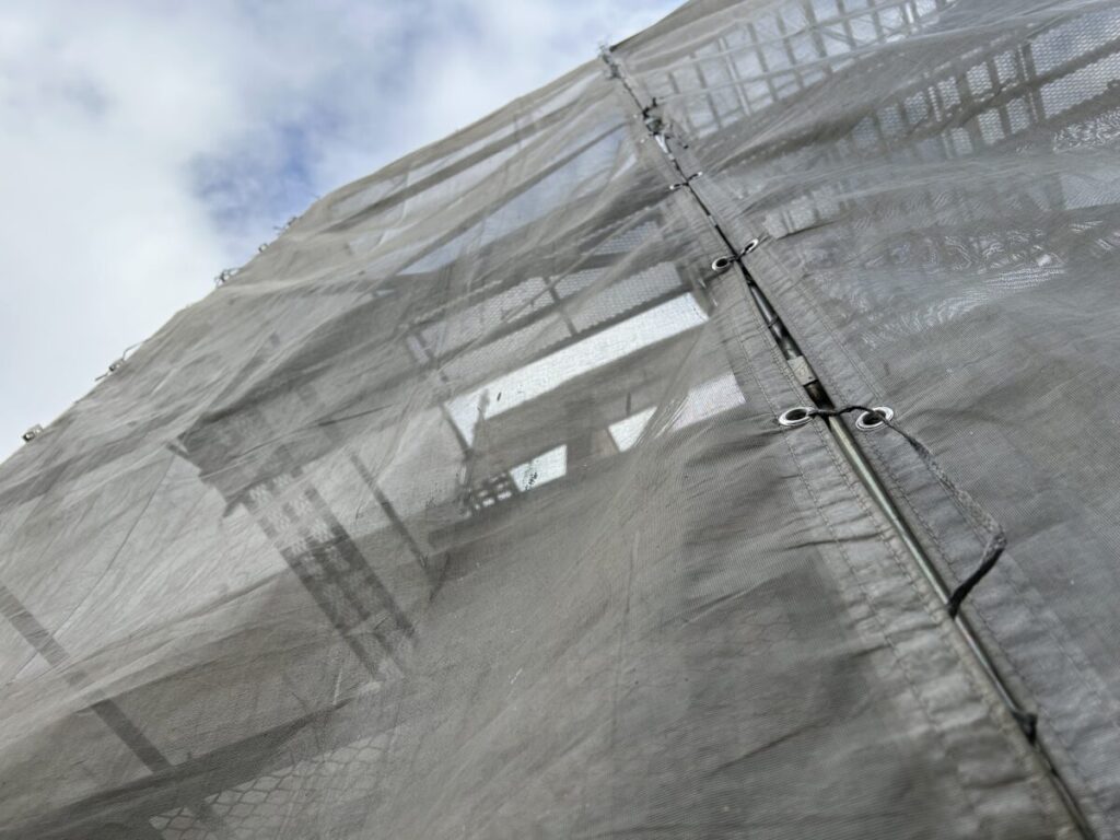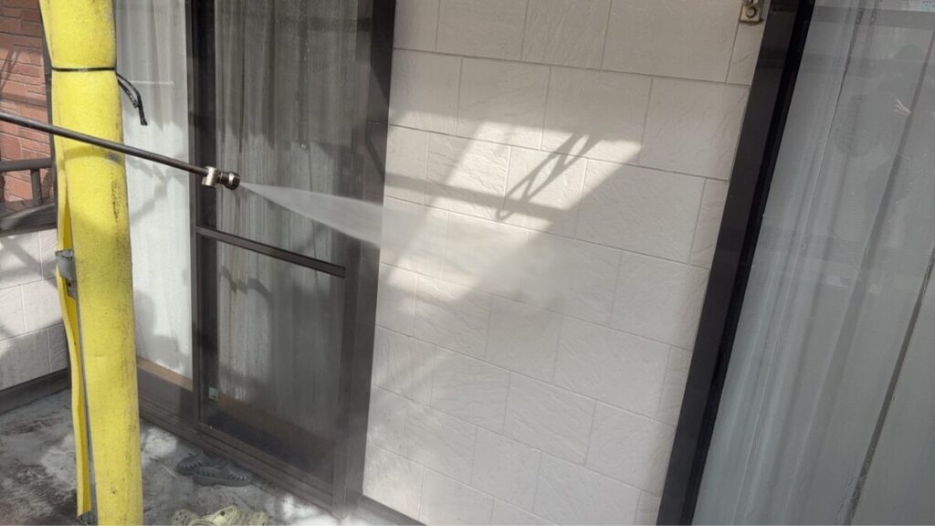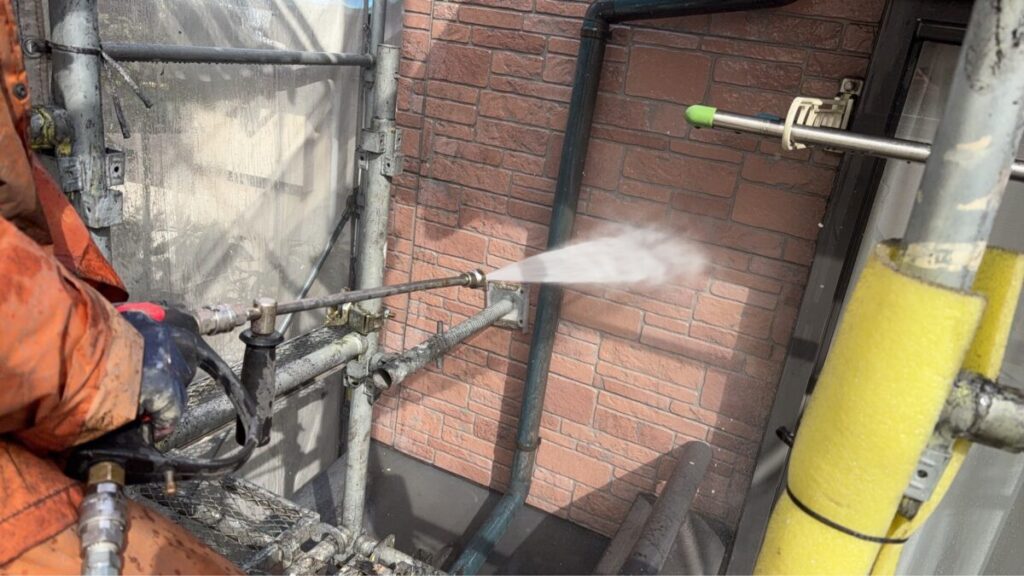 昨日足場設置(BIKEクサビ緊結式足場)を終えた現場の施工初日、洗浄処理に立ち会いました。