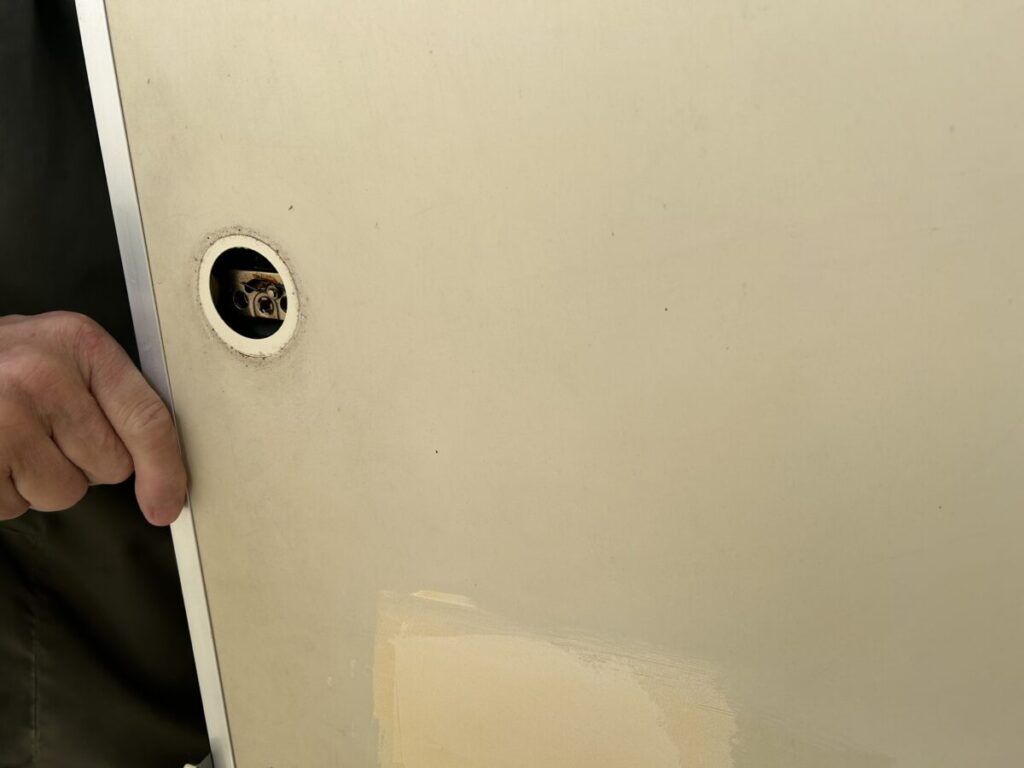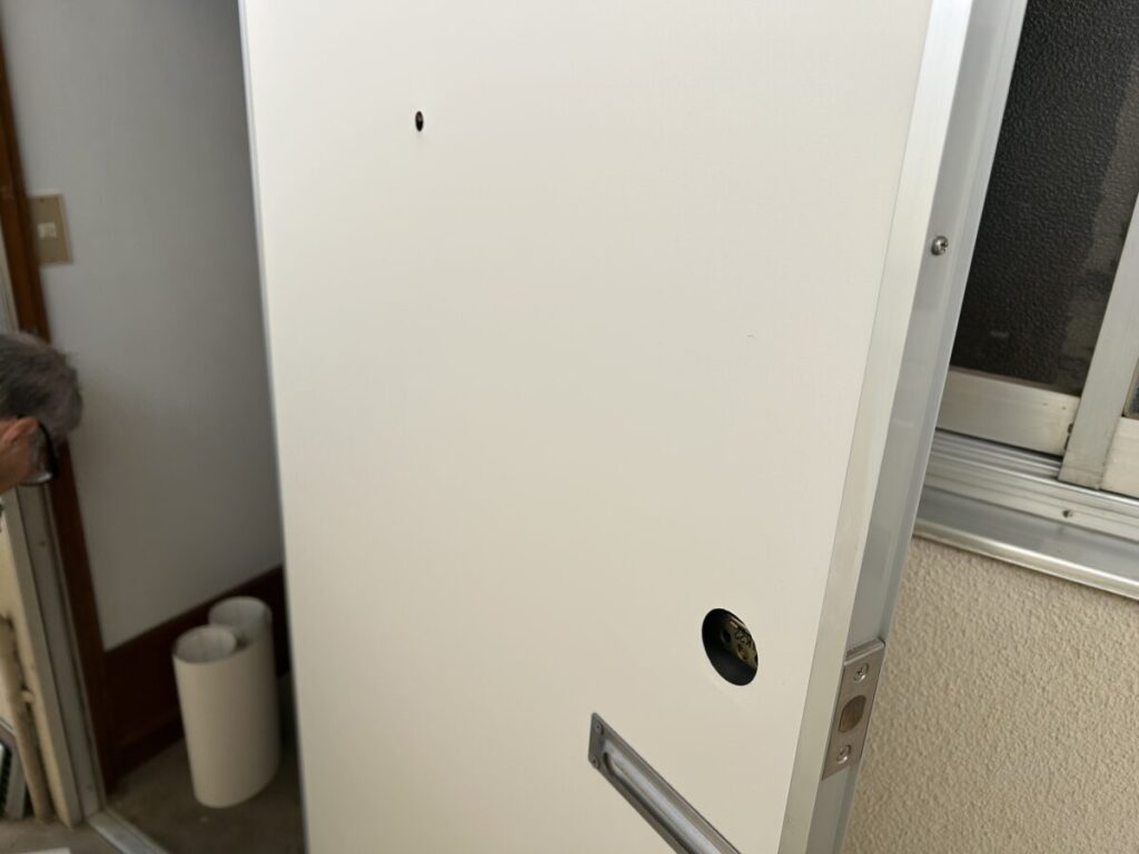 経年劣化等で扉に大小のおおきさの「窪みが」あったので、パテ処理を行い可能な限り平らに戻し、ドアアイやガラリなど外せる機構部の脱着を行いダイノックシートを張りました。