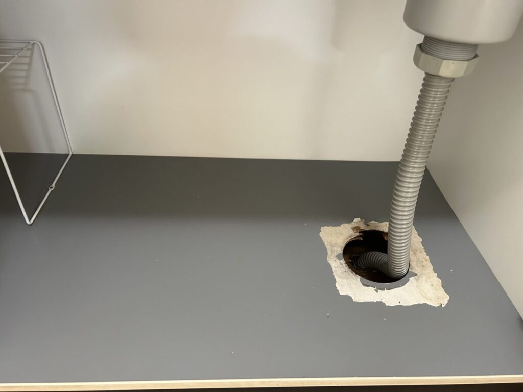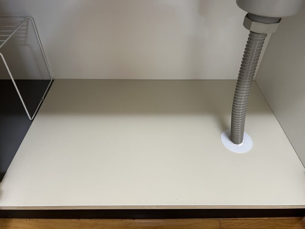 こちらはメーカー既製品ではなく採寸を行い作成したアルミ板になりますが、セパレートキッチン流し台の排水部の穴を塞ぎました。