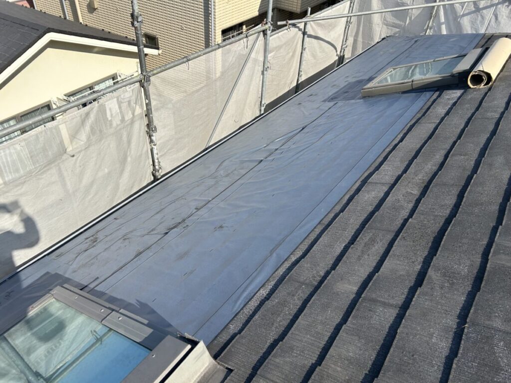 使用する新規下地防水紙は粘着性があり釘穴のシール性に優れている「タジマルーフィング株式会社 アスヤンSB200」を使用しています。洗浄処理を行っているおかげで既存平板スレート屋根材との密着も良く、写真にもある「明り取り」(トップライト)周辺も安心できる張り仕舞いになりました。(明り取り周辺は改めて板金で排水機構を作成して取り付けます)