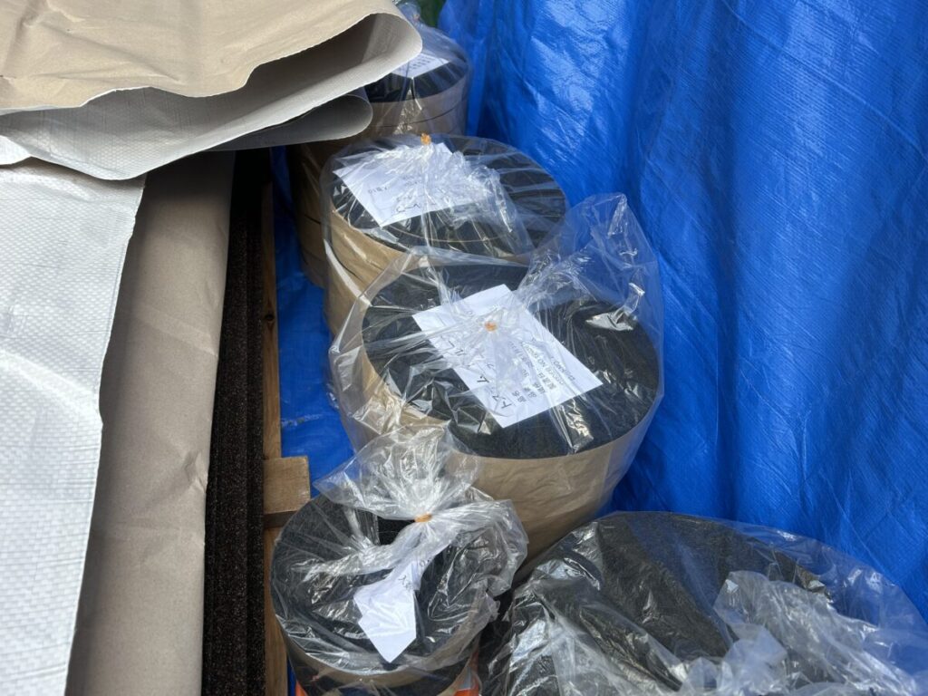 直に地面に置かず、また置く場所にもキズ等が発生しない様に厚手のべニア板を設置、搬入後には厚手のブルーシートで包み雨が降っても汚れない様に処理をしておきます。