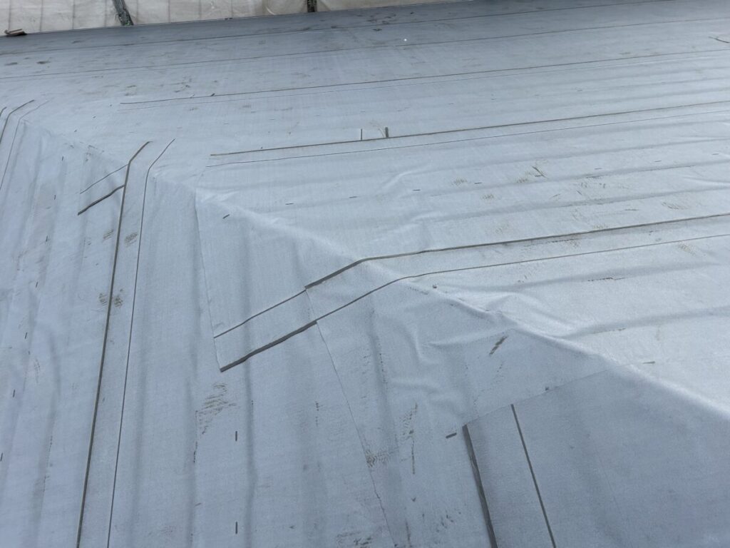 粘着性のある下地ルーフィングを張るのは難しく、弊社では必ず2人1組で施工するようになっています。それは屋根の勾配によって使用するルーフィング材が自重で軒先方向に滑って行ってしまうのを止めるためです。下地ルーフィング材は1本が大体20キログラム前後ありますし、私もたまに手伝いますが本当に大変だと思います。ですが見えなくなる下地材だからこそシッカリと施工しておかないと、新しい屋根材を施工する際にどんな影響が出るか分かりませんので細かく目視での確認をします。