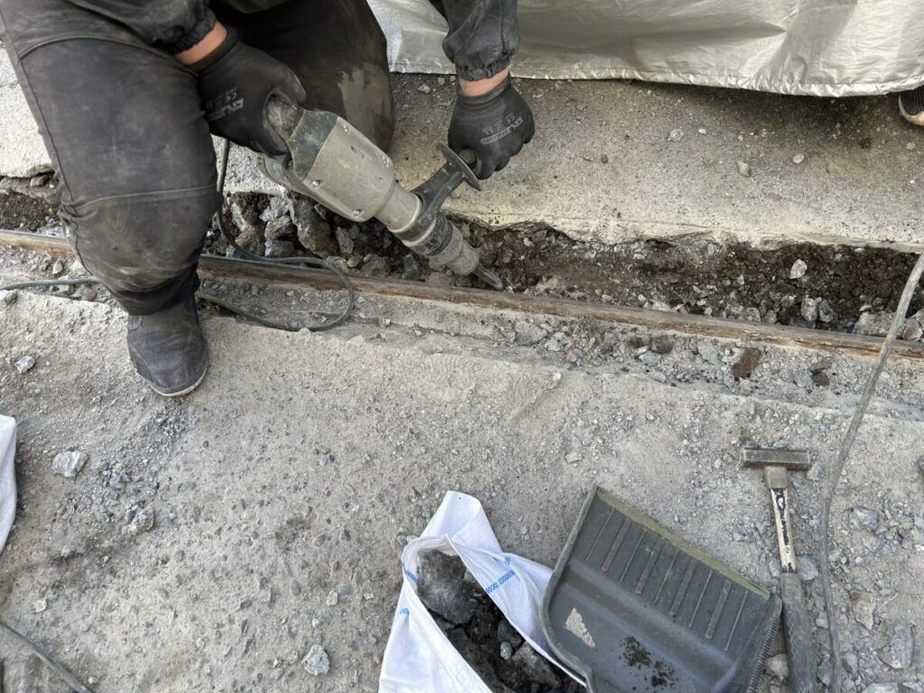工事内容は既存の鉄製スライド門扉を解体し、アルミ製の軽量スライド門扉に交換となります。まずは3メートルほどのスライド門扉本体2か所を取り外し切断処理、そこから埋設されているレールを取り出します。事前にコンクリートに切断範囲の切り込みラインを2本入れ、「ハツリ機」と言う工具を使用した際にそのラインより外のコンクリートに影響が出ない様にします。また支持柱も複数本あったので、同様に取り外していきます。