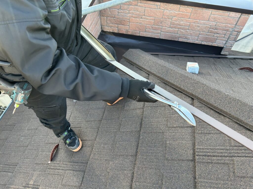 先日いちばん時間が掛かると予定していた明り取り部の処理が終わったこともあり、とても順調に施工が進み、谷部のカバー(横風等で雨やゴミが入らない様にする処理)棟板金の納めと雪止め取付が終わるところでした。細かな部分の処理がありますが残り1日で屋根工事も完了できる予定です。