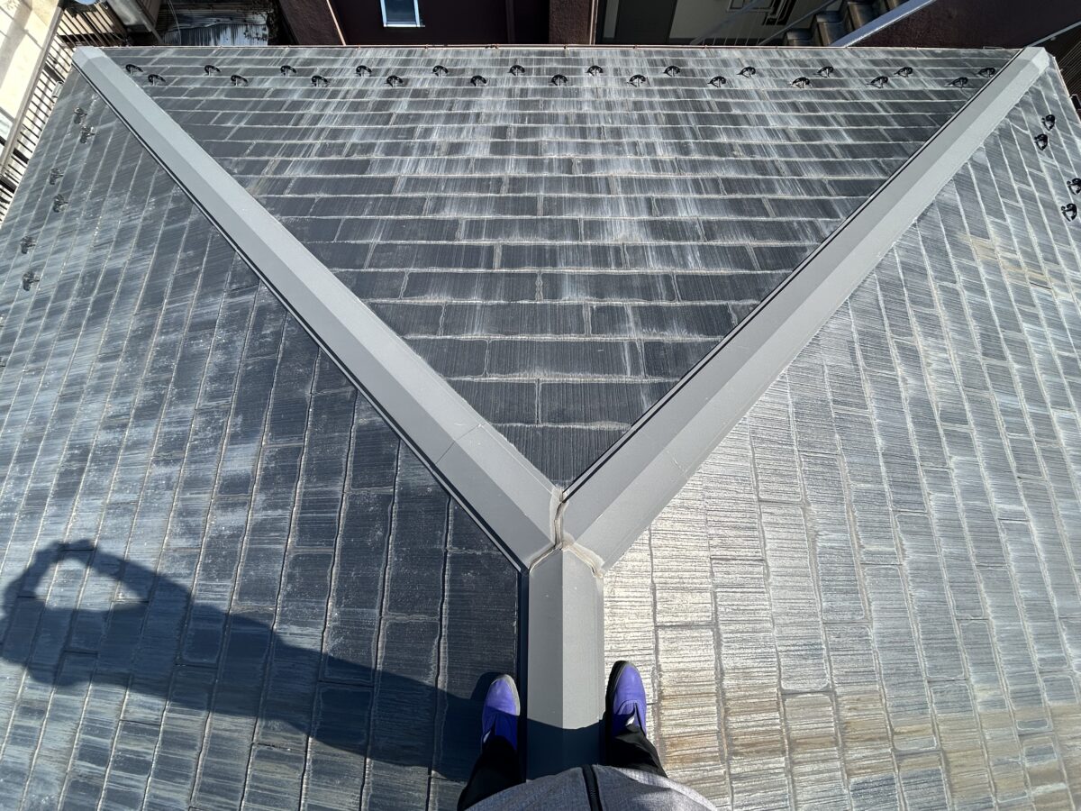 屋根基材は一般的な平板スレート屋根材でした。要所要所でお手入れをされており築年数からみると、基材の状態は良く屋根全体を歩行して強度確認・目視と触診で細部を確認しましたが、棟板金部分の防水処理(シーリング)以外に雨漏りに直結するような部位の劣化は見つけられませんでした。詳細をお伝えしてお客様の要望をお聞きし見積書提出までの流れを説明させて頂きました。