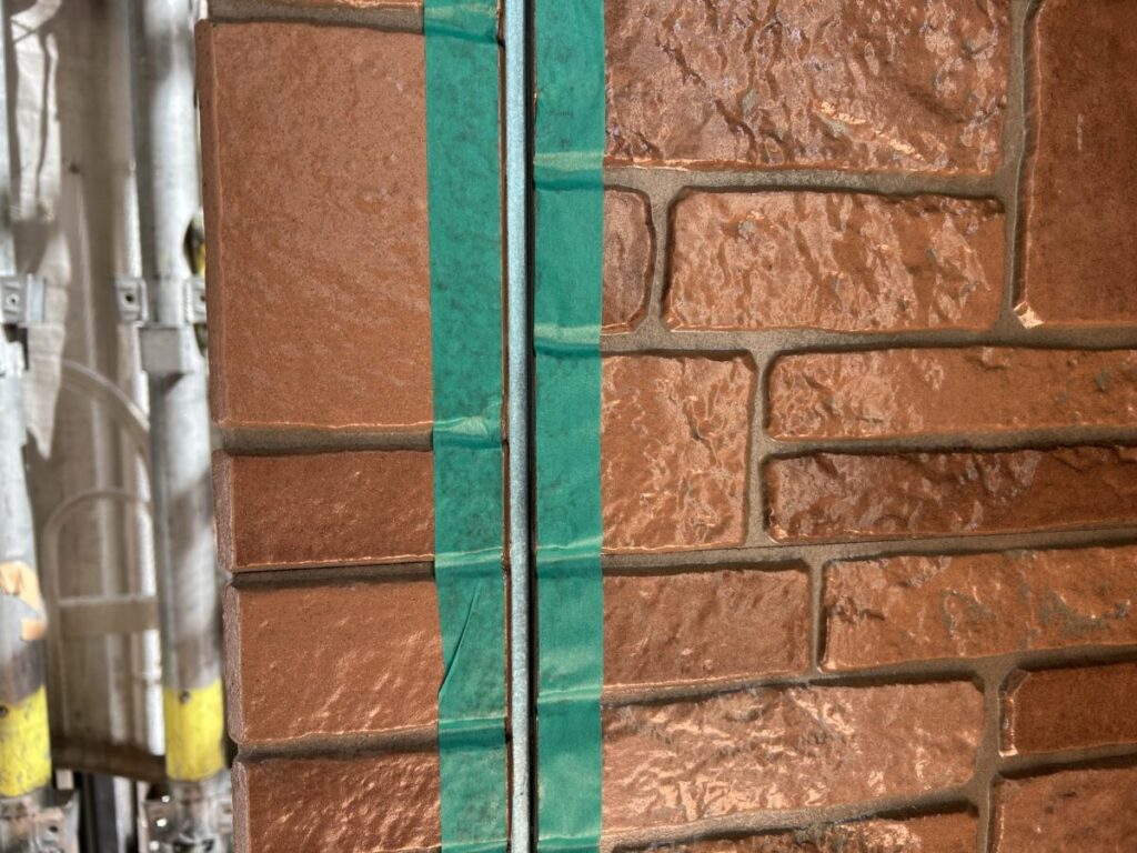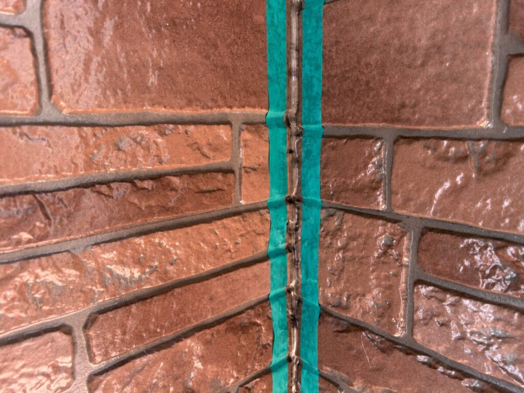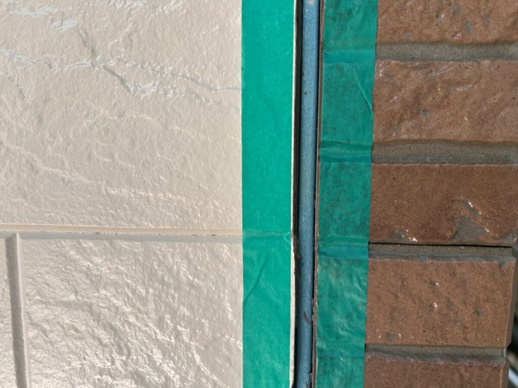 すでに着色部とクリア材塗布部の塗装工事は完了しており、到着した時点で既存の目地材を撤去しマスキングテープを張り付け、プライマー塗布を終えた後でした。