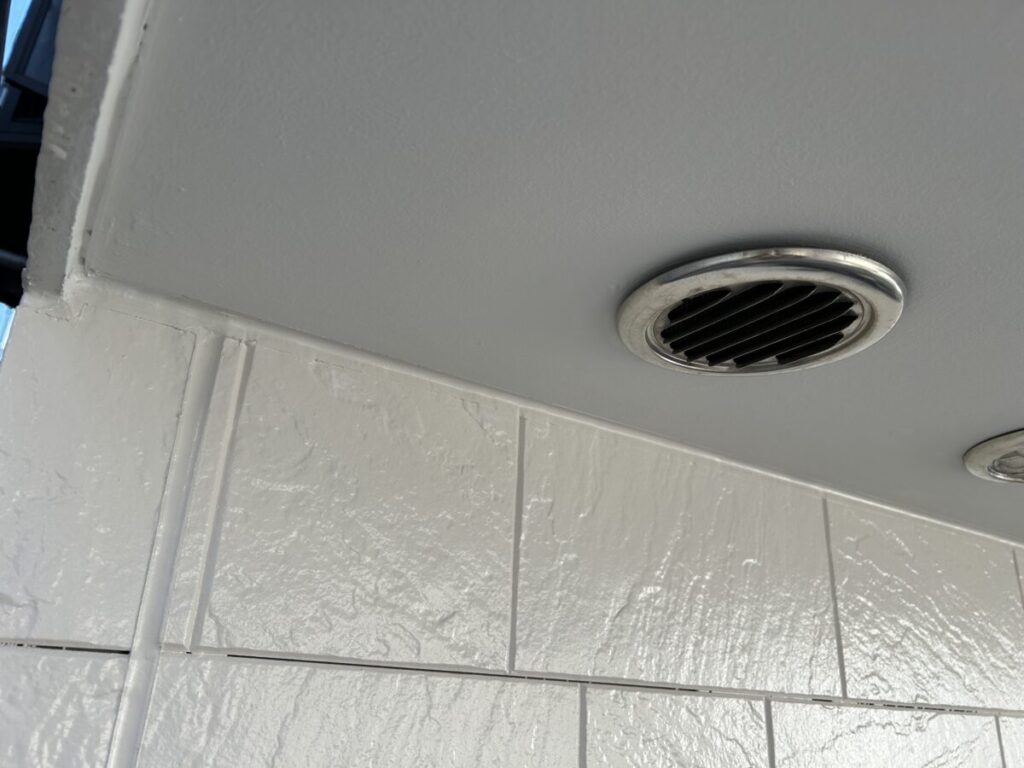 窯業外壁材の役物部・入隅突付け部・軒天井部・立トイ支持金具部など足場を何周も廻り、下から見上げ・上から見下ろし・横から覗き込み仕上がりを確認しました。施工中に何度も確認を行っているので不安はないのですが、職人さんが見落としてしまった施工部を見つけるのが現場管理の仕事ですので丁寧に行いました。