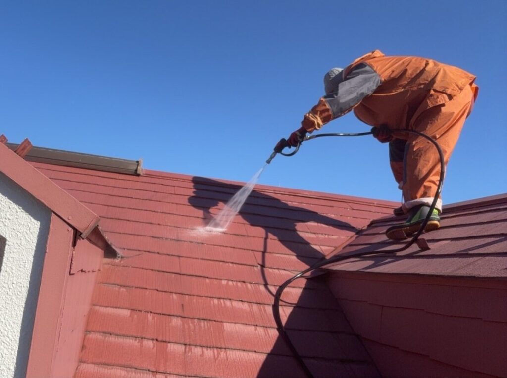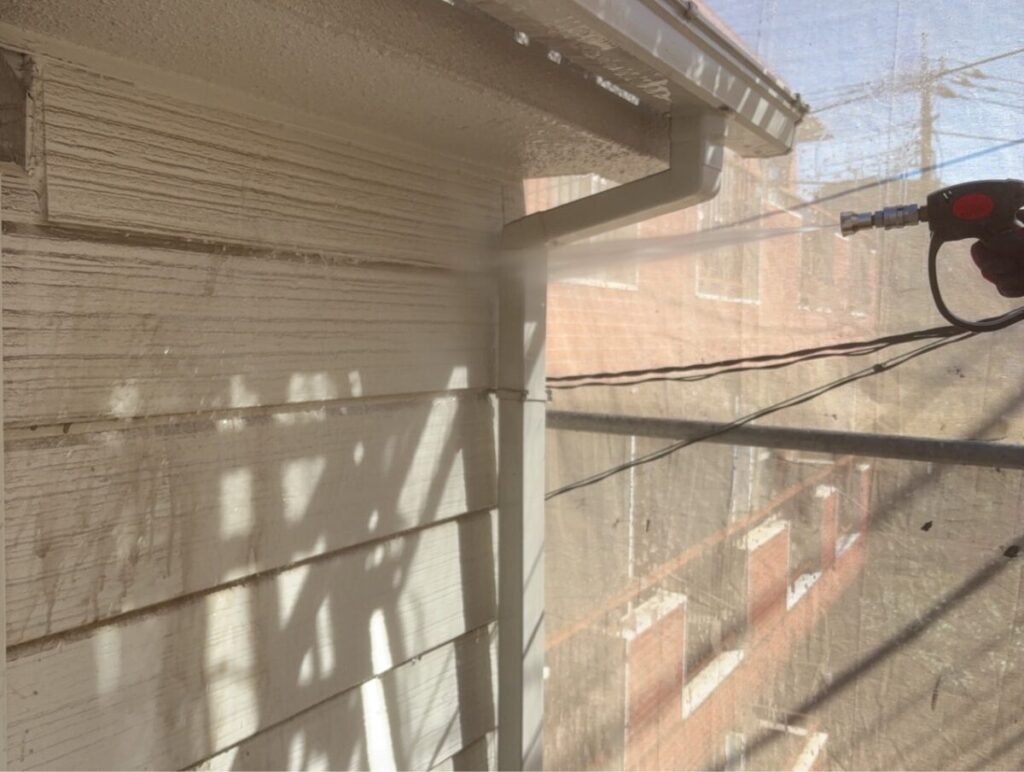 工事内容は屋根と外壁など家屋全体の塗装となっています。私は直接施工を行う訳ではないですが、職人さんと同様に上下にレインスーツを着込み各部位の汚れの落ち方を目視で確認します。また雨トイ内部やベランダ内部排水溝に溜まっていた枯葉やゴミなどがシッカリと流れ綺麗になっているのかも同時に確認していきます。また洗浄処理は高所から汚れを低所に流しますが、水圧で一度洗浄を終えた場所に汚れが飛散する事も多く、洗浄を行う職人さんの周りを邪魔にならない様に動き目視確認していきます。