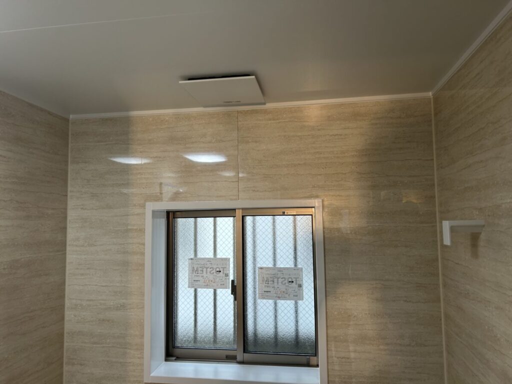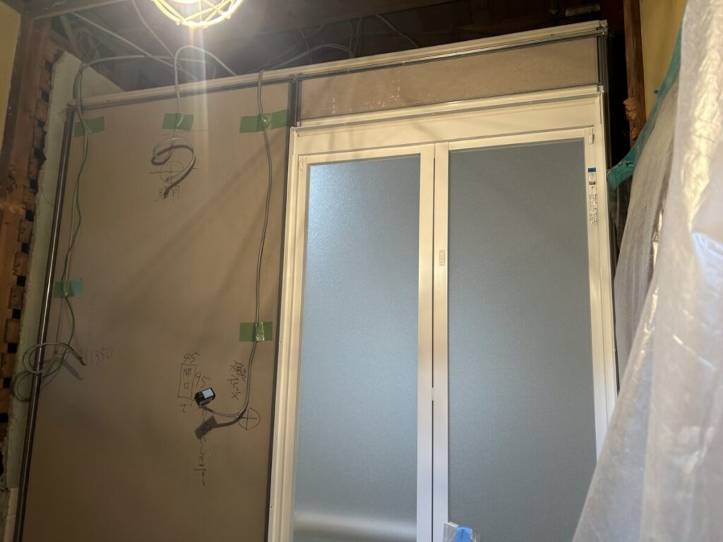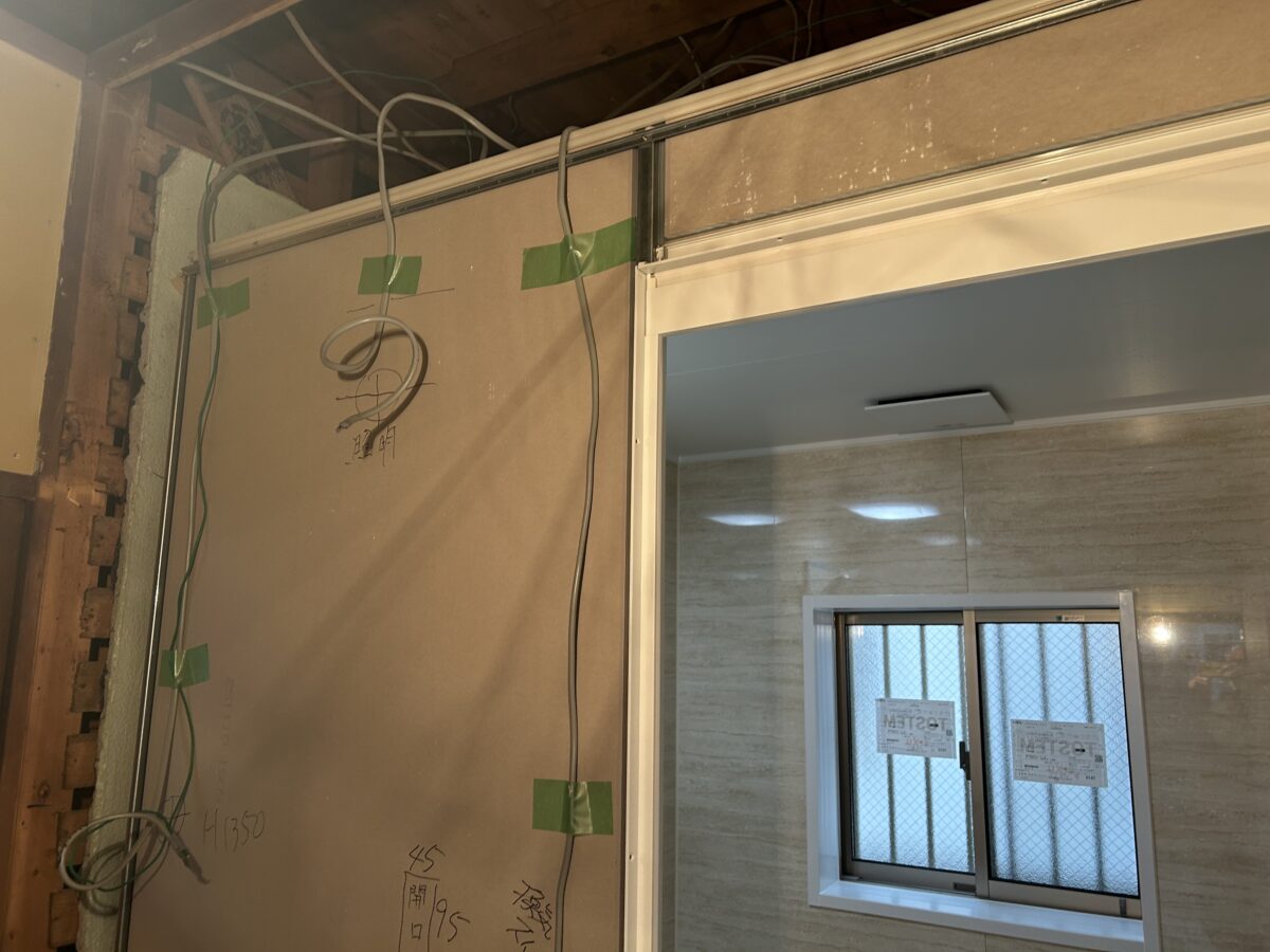 肝心の浴室改修工事は大工さんによる開口部枠材設置と脱衣所壁面の壁材下地張りまで進行していましたので、残すは電気配線接続工事・洗面化粧台設置と新規浴室へのお湯張り確認と排水確認・壁紙張り工事となっていました。