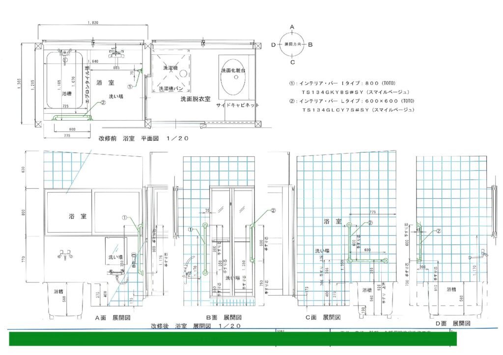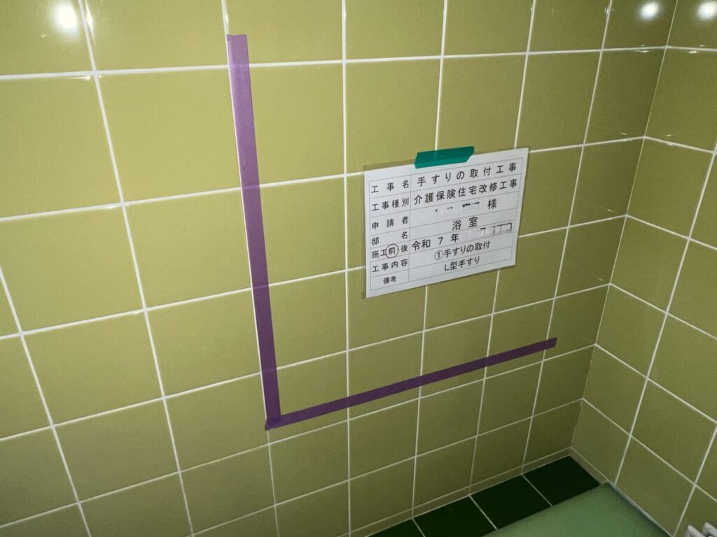 実際にご使用になるH様の身長・脱力している状態での手の位置・自然に腕を曲げた時の位置・浴室への出入りで日常的に手をかけている場所・浴槽内に入る際に足を上げる場所・浴槽から出る際に足をつく場所・座った際に邪魔にならないか・立ち上る際に利用できるか・導線の邪魔にならないか…等を何度も何度も程確認します。