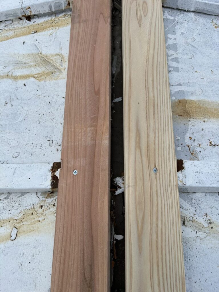 これは、新規棟板金は側面から固定する際に「厚みがないと木材が裂けてしまい、ビスの引抜値が下がってしまうから」です。