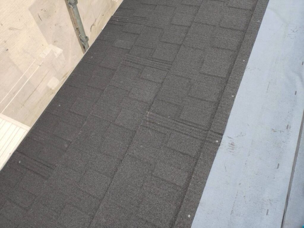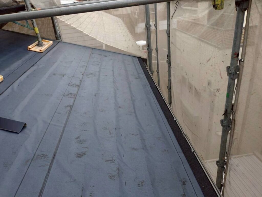 大まかなイメージとしては下地防水紙を既存屋根材に貼ります。(弊社では粘着式の改質アスファルトルーフィングを使用)